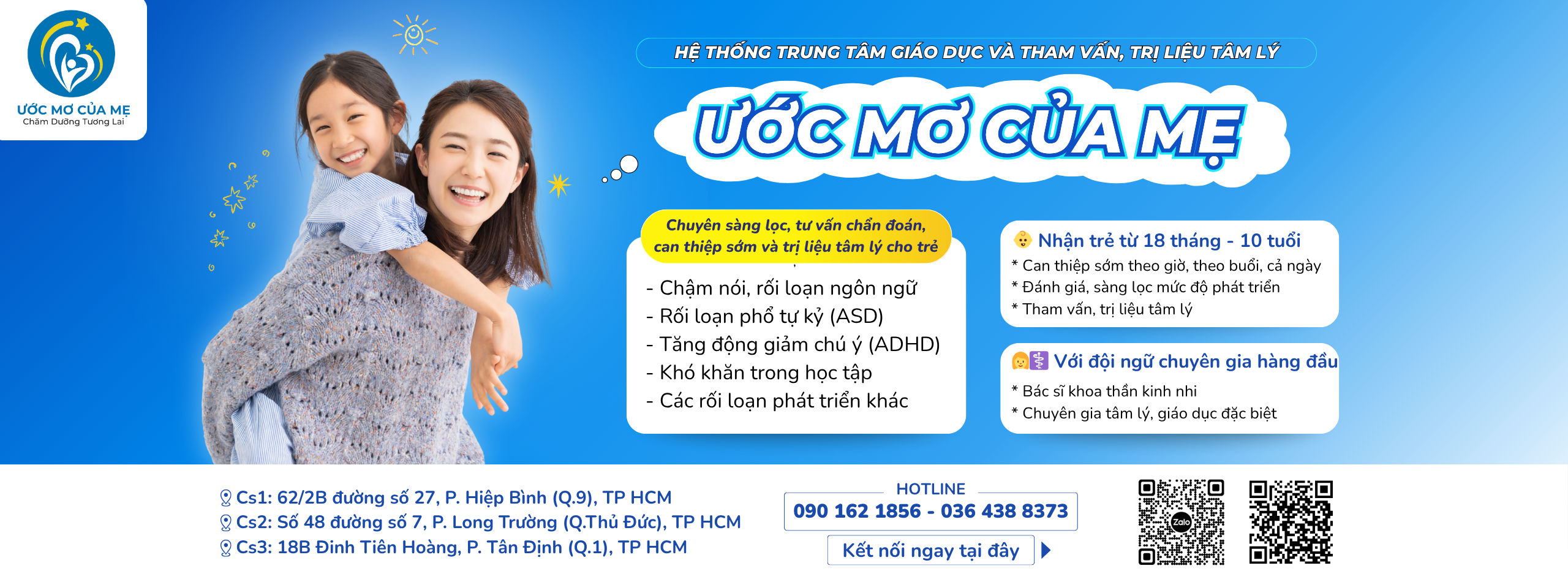 Đội ngũ chuyên gia tại Ước Mơ Của Mẹ bao gồm các bác sĩ chuyên khoa thần kinh nhi, chuyên gia tâm lý giáo dục đặc biệt, và chuyên viên trị liệu ngôn ngữ. Với kinh nghiệm trong hỗ trợ trẻ chậm nói, rối loạn ngôn ngữ, phổ tự kỷ, tăng động giảm chú ý và các khó khăn phát triển, chúng tôi cam kết mang lại sự chăm sóc tối ưu và chuyên nghiệp nhất cho mỗi trẻ.z
